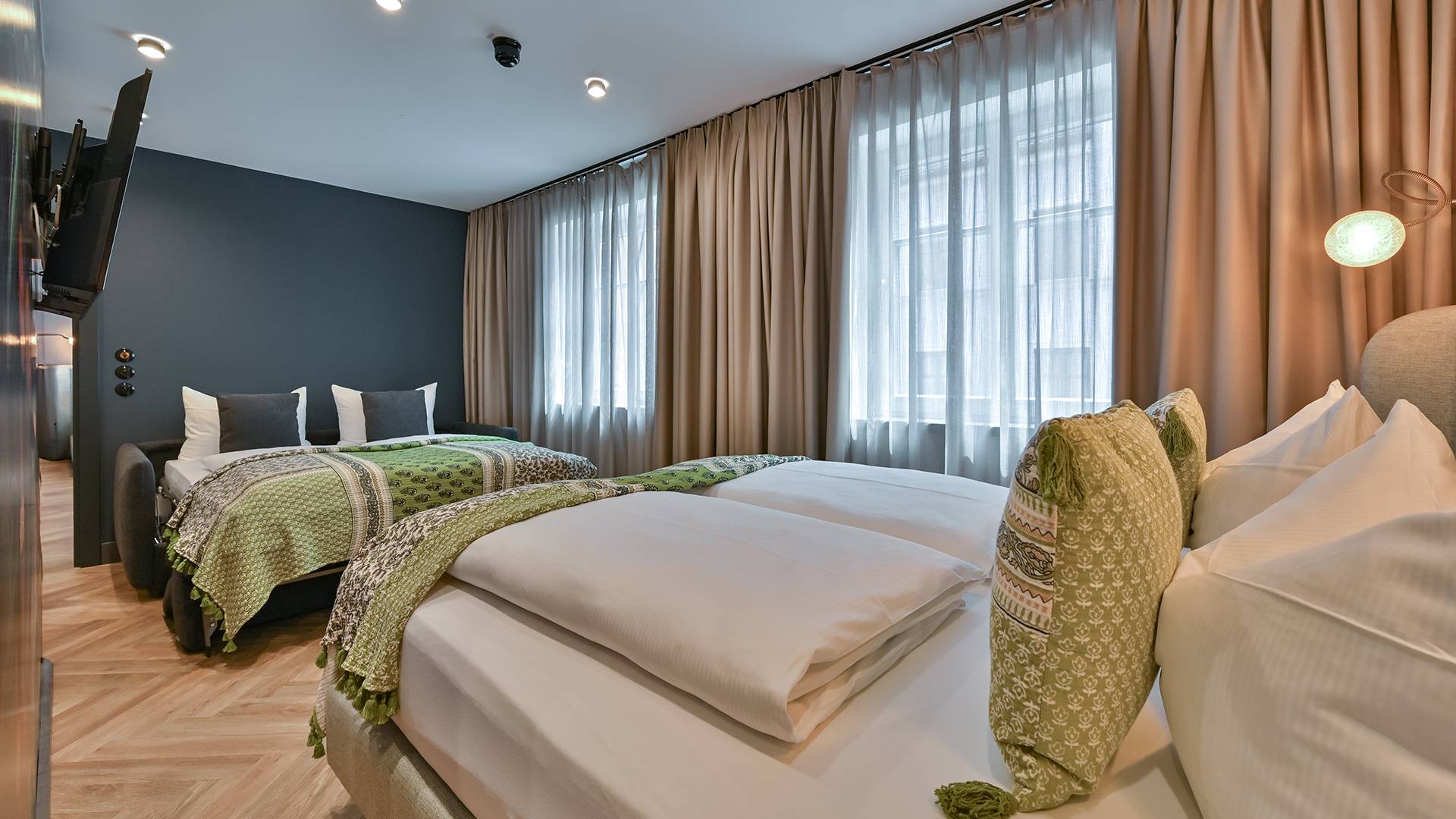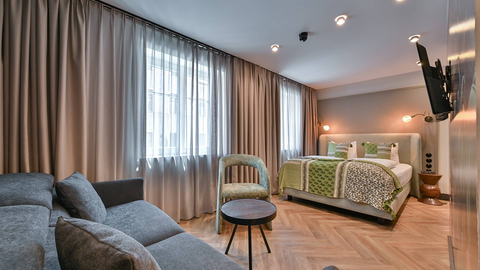 Mit Verbindungstür, Klimaanlage, Highspeed-WLAN und 40'' Smart-TV bleibt kein Wunsch offen. Das offene Badezimmer mit moderner Regendusche, Bademänteln, Hausschuhen und kostenlosen Pflegeprodukten sorgt für Wellness-Feeling. Ein abschließbares WC, Minibar/Kühlschrank und ein Safe runden die Ausstattung ab.